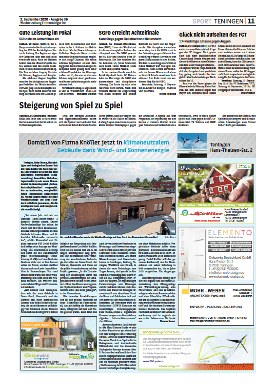 Die Wochenzeitung hat einen ausführlichen Artikel über unser klimaneutrales Firmengebäude veröffentlicht. Zum vollständigen Bericht auf Seite 11 bitte