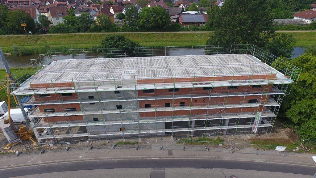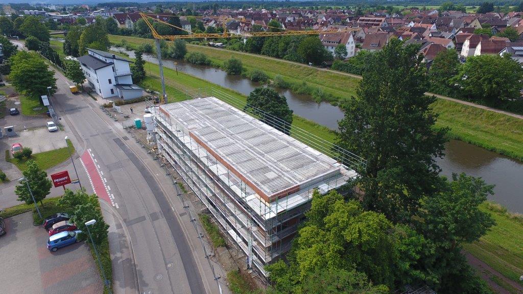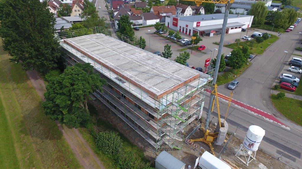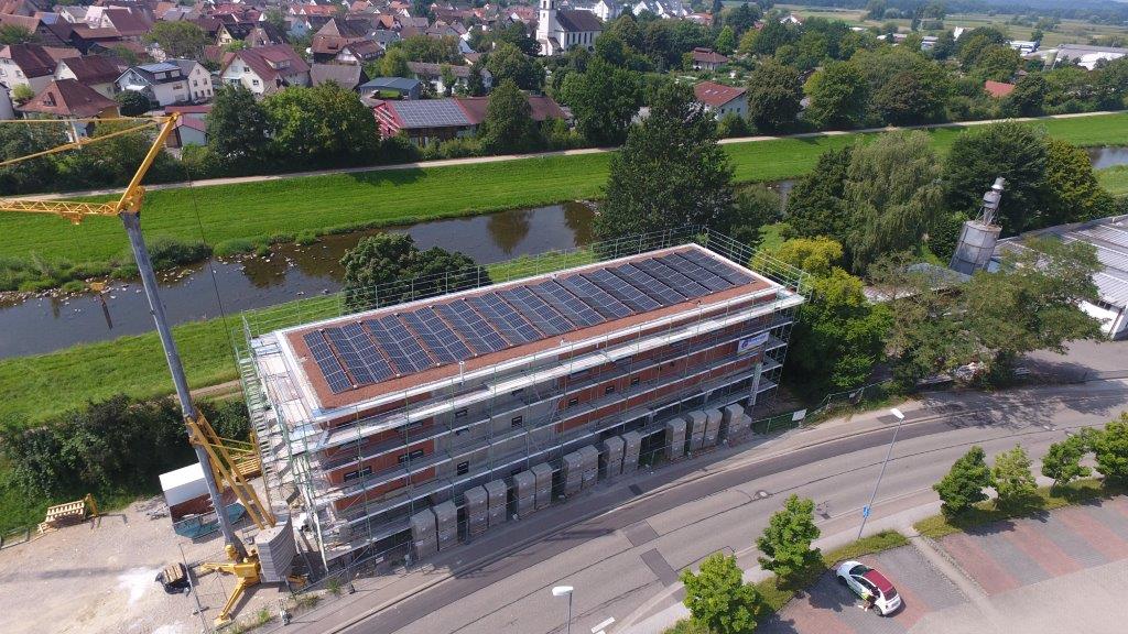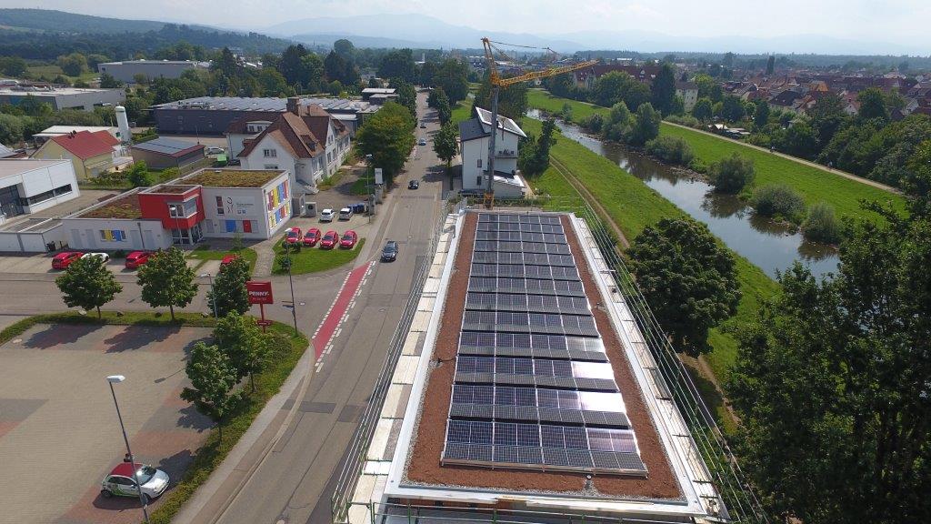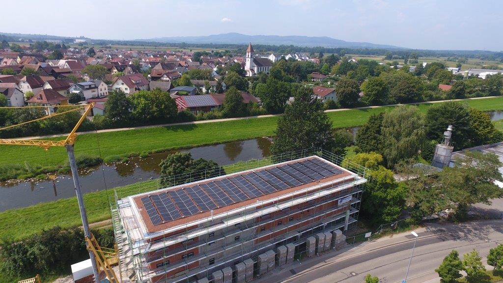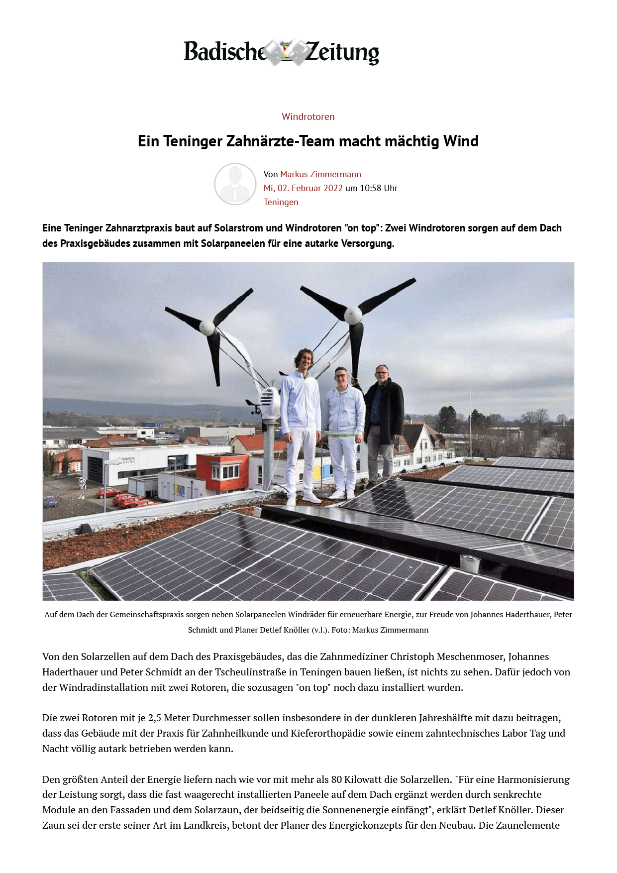 Von den Solarzellen auf dem Dach des Praxisgebäudes, das die Zahnmediziner Christoph Meschenmoser, Johannes Haderthauer und Peter Schmidt an der Tscheulinstraße in Teningen bauen ließen, ist nichts zu sehen. Dafür jedoch von der Windradinstallation mit zwei Rotoren, die sozusagen "on top" noch dazu installiert wurden.