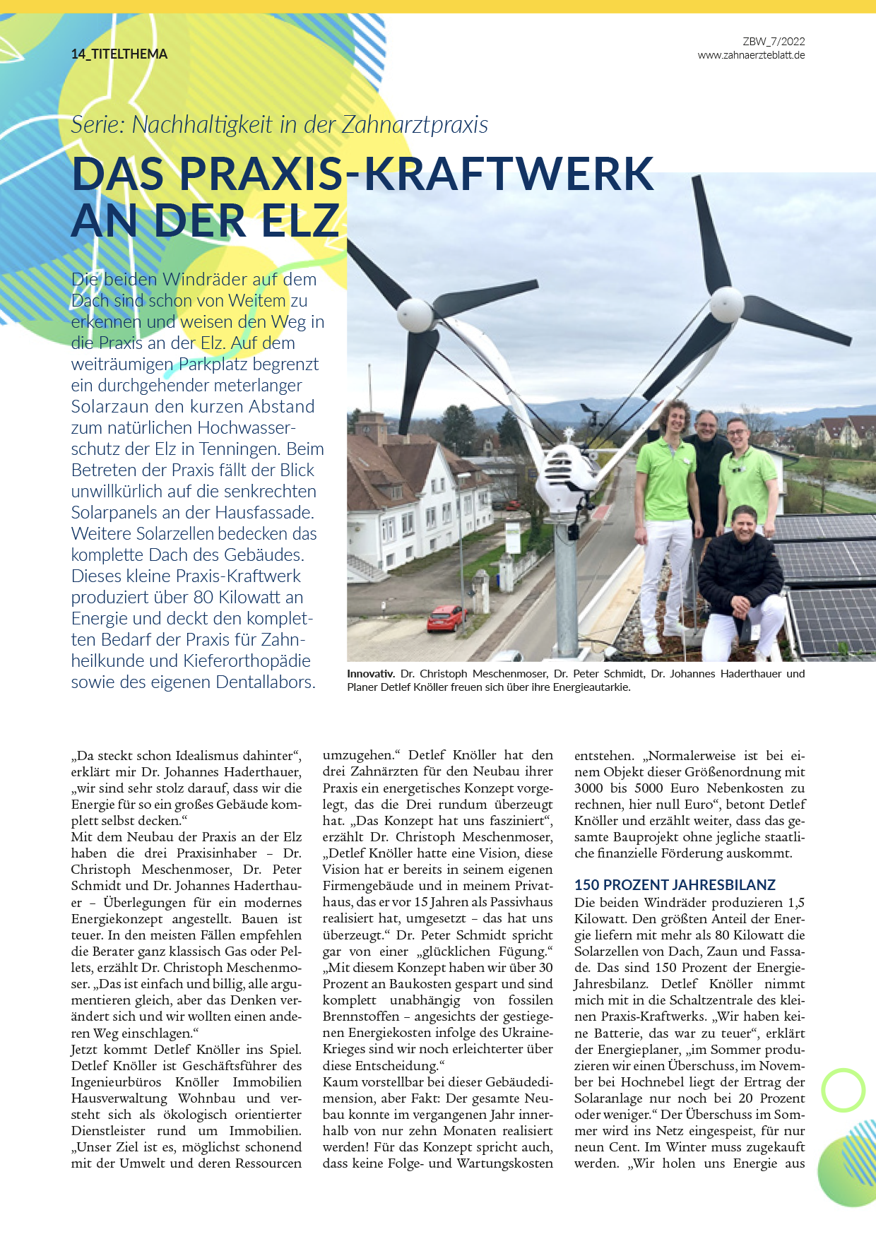 In der kommenden Ausgabe des Zahnärzteblattes BW lautet das Titelthema "Nachhaltigkeit in der Zahnarztpraxis" und hierfür wurde unser Bauprojekt als Paradebeispiel herangezogen. Wir sind sehr stolz, dass unsere energieautarke Zahnarztpraxis Meschenmoser, Schmidt & Haderthauer soviel positive Resonanz in der Medienlandschaft hervorgerufen hat. Über den Link gelangen Sie zum vollständigen Bericht.