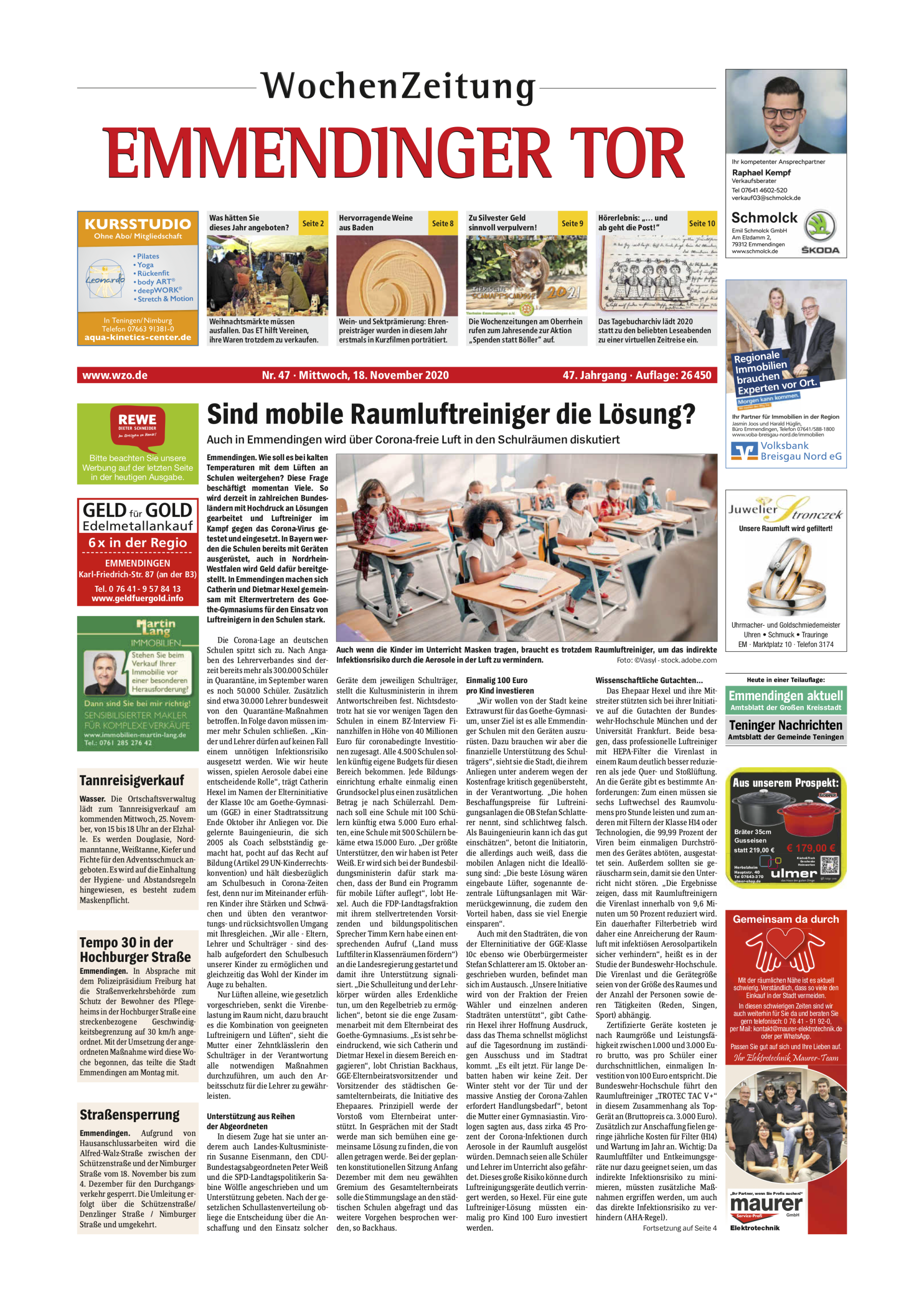 Wie soll es bei kalten Temperaturen mit dem Lüften an Schulen weitergehen? Diese Frage beschäftigt momentan Viele. So wird derzeit in zahlreichen Bundesländern mit Hochdruck an Lösungen gearbeitet und Luftreiniger im Kampf gegen das Corona-Virus getestet und eingesetzt. In Bayern werden die Schulen bereits mit Geräten ausgerüstet, auch in Nordrhein-Westfalen wird Geld dafür bereitgestellt. In Emmendingen machen sich Catherin und Dietmar Hexel gemeinsam mit Elternvertretern des Goethe-Gymnasiums für den Einsatz von Luftreinigern in den Schulen stark. (Emmendinger Tor, Nr. 47, 18.11.2020)